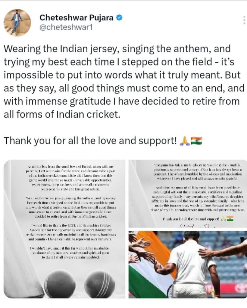24 August 2025 ko Cheteshwar Pujara ne officially all forms of Indian Cricket se retirement announce kar diya.